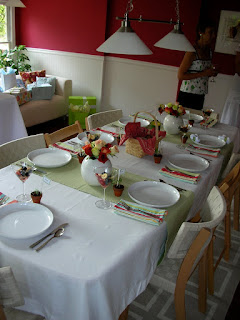 Meg set a beautiful table. I remember asking about where to get flowers, and she was able to pick up these assorted roses for a steal, and I really felt like they pulled together her lime theme along with the bright fruit she served (notice the fruit was served in the martini glasses...very cute!) and her beautiful dining room.